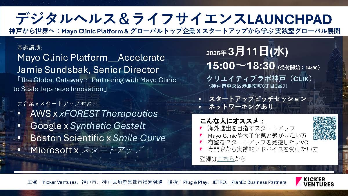公益財団法人神戸医療産業都市推進機構【3/11開催】KICKERデジタルヘルス&ライフサイエンスLAUNCHPAD-神戸から世界へ‐