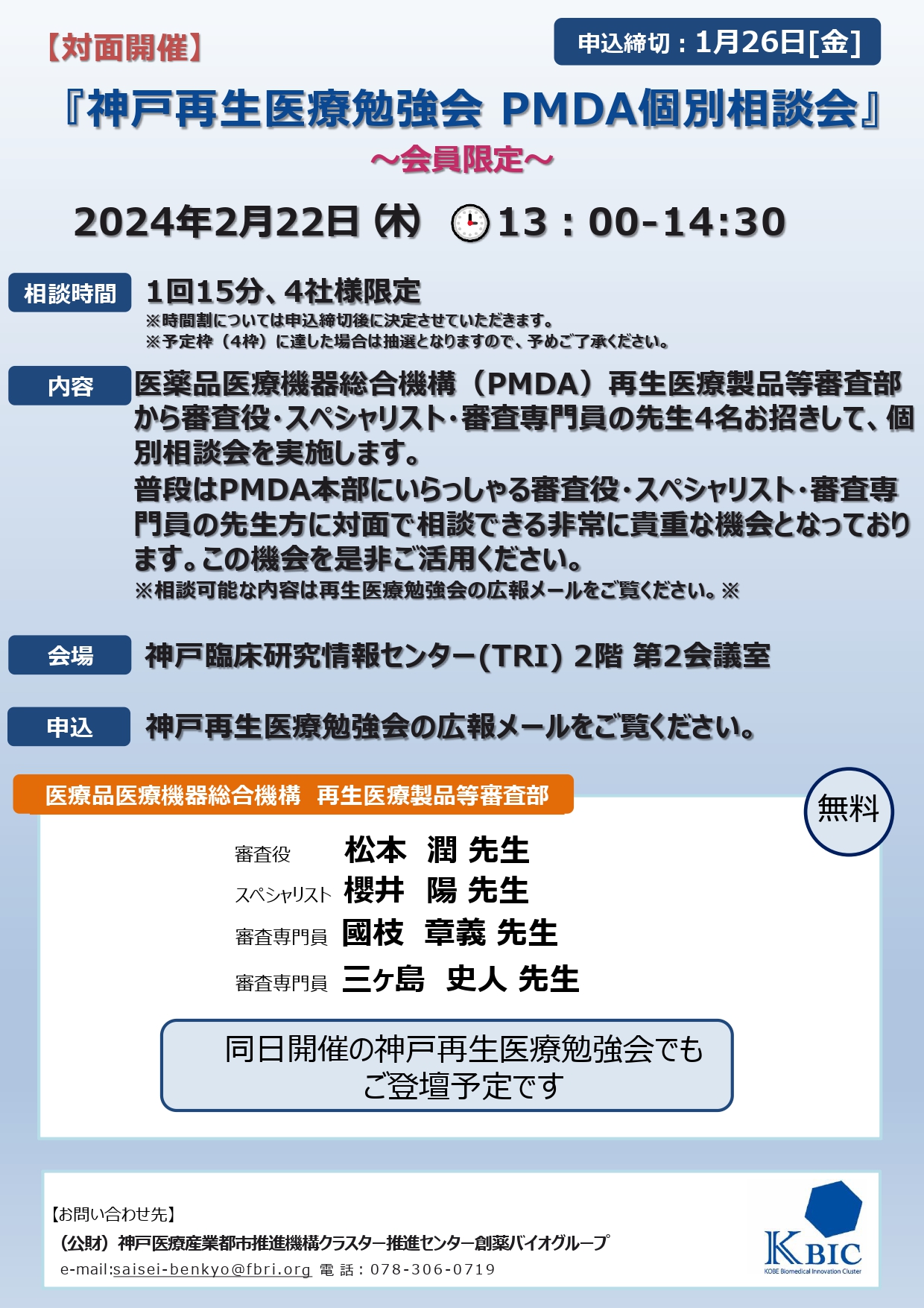 また同日の勉強会前には、講師の先生方及びPMDA再生医療製品等審査部の松本審査役によるPMDA個別相談会を実施いたします。PMDA相談実施のご経験がない、PMDA相談の進め方がわからない企業様など、PMDA相談に行く前の準備としてご活用いただけます。(詳細は添付資料をご確認ください。)