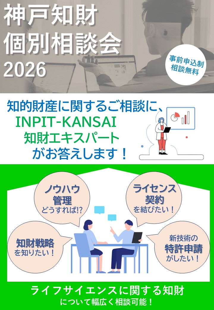 神戸知財個別相談会では、広くライフサイエンス分野における知的財産に関するご相談をお受けしております。随時開催しており、個人・アカデミア・企業等あらゆる方を対象に、知財に関する基本的な内容から事業の根幹に関わる本格的なご相談まで幅広く対応しております。