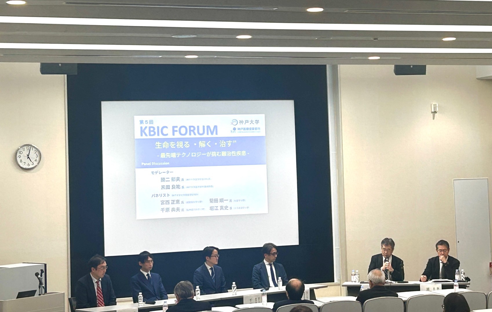 3月3日、第5回KBIC FORUMが “生命を視る・解く・治す” -最先端テクノロジーが挑む難治性疾患-をテーマとして開催されました。今回は、神戸におけるサイエンスの中心的役割を担う、神戸大学大学院医学研究科の先生方による講演とパネルディスカッションです。「造血幹細胞研究」、「神経免疫研究」、生物の内部を可視化・解析する技術である「生体イメージング」の活用、組織や細胞の位置情報とともに分子情報を解析する「空間オミクス」の活用について、4名の先生から最先端の研究内容が紹介されました。パネルディスカッションではそれぞれの研究の未来や最新のテクノロジーを活用した近未来について議論が交わされ、神戸医療産業都市のコミュニティーを活かし、革新的な医療技術を社会実装することへの期待と決意が語られました。